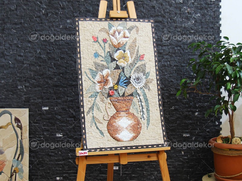 Mermer doğal taş mozaik tablo ile duvarınızı sanat galerisine çevirebilirsiniz. Evinizin bir duvarını solmayan çiçekler ile renklendirin. Duvar dekorasyonu için tasarlanan modern doğal taş tablolar ister çerçeve ile istenirse direk duvara yapıştırılarak kullanılabilir.